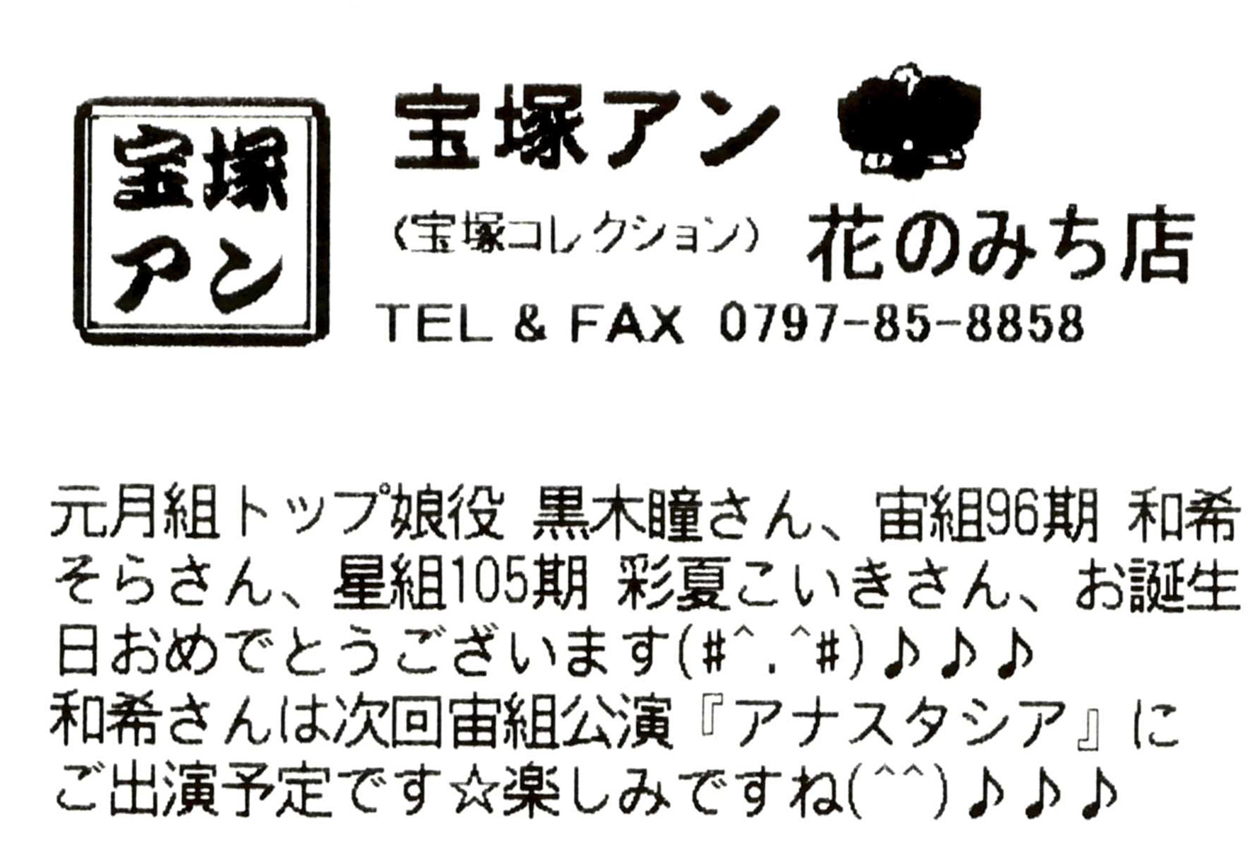 元月組トップ娘役 黒木瞳さん、宙組96期 和希そらさん、星組105期 彩夏こいきさん、お誕生日おめでとうございます(♯^.^♯)♪♪♪