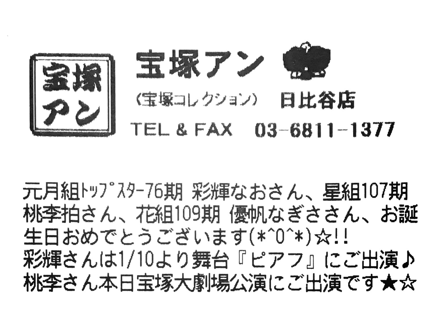 https://www.takarazuka-an.co.jp/blog/wp-trackback.php?p=47065【宝塚アン】日比谷店より