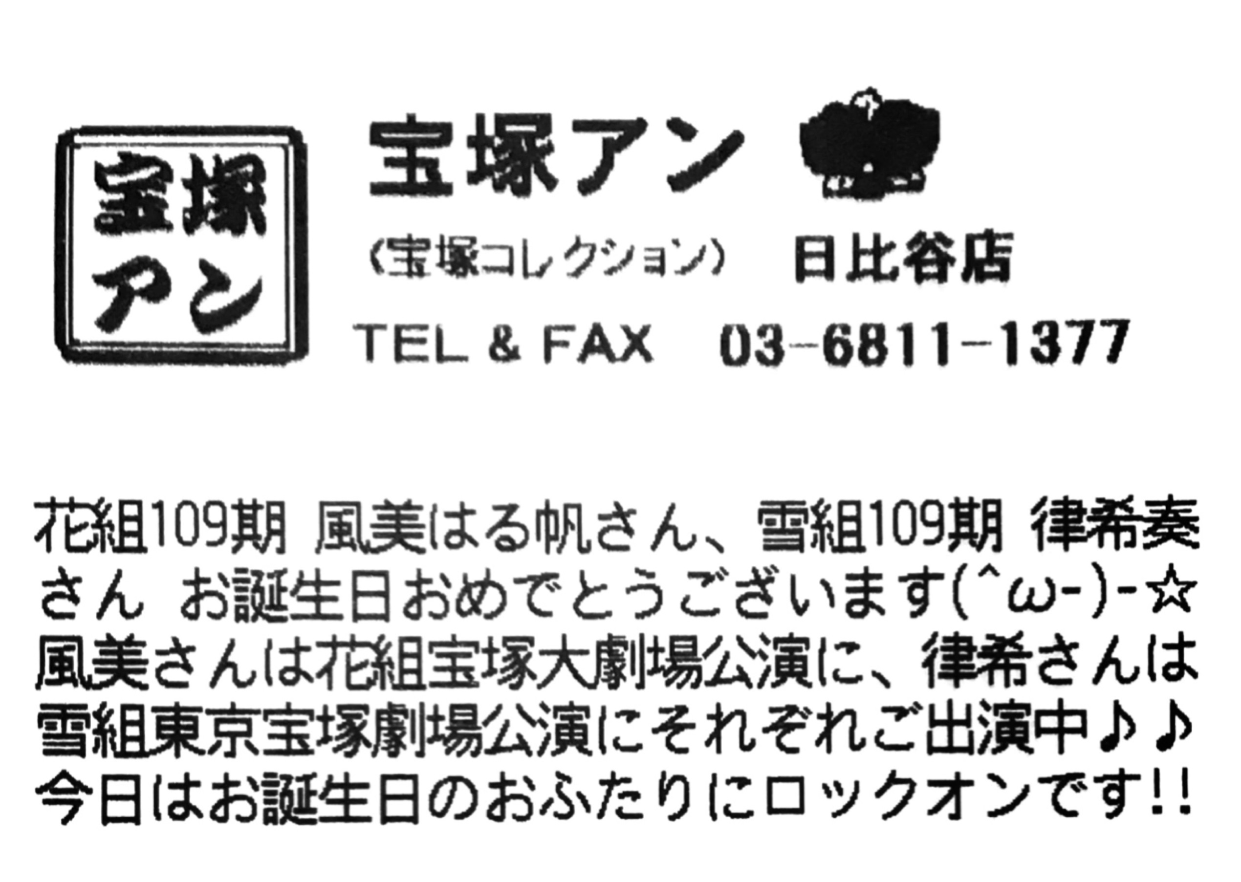 花組109期 風美はる帆さん、雪組109期 律希奏さん お誕生日おめでとうございます(^ω−)−☆🎂🎊