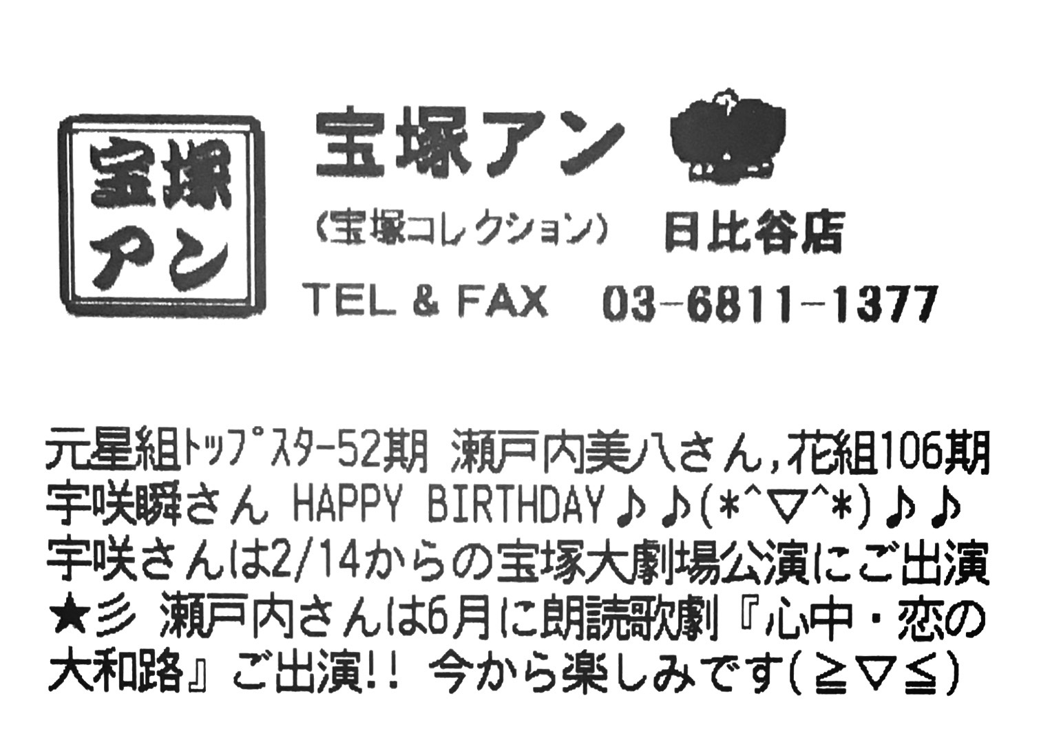 宇咲さんは2/14からの宝塚大劇場公演にご出演💐✨瀬戸内さんは6月に朗読歌劇『心中・恋の大和路』ご出演‼️今からとても楽しみです❄️☆*:.。.