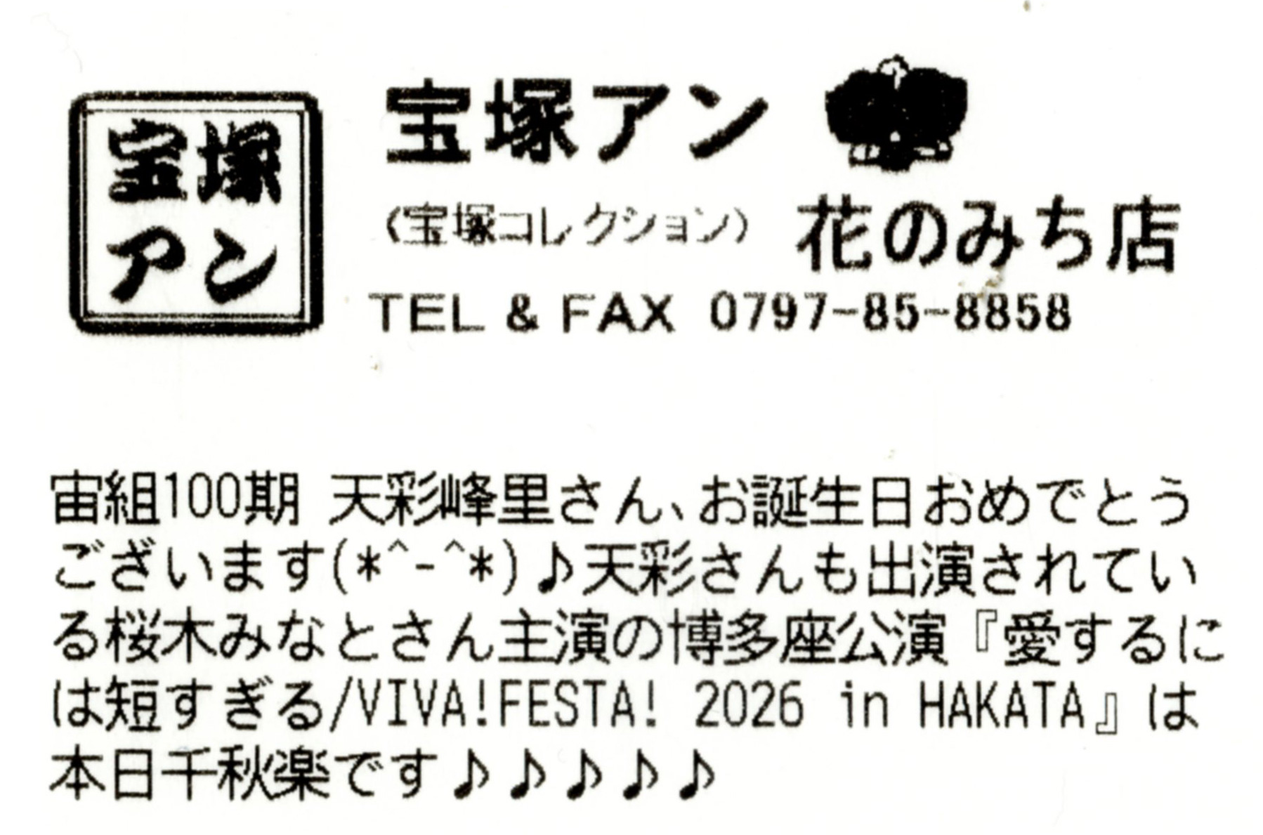 天彩さんも出演されている桜木みなとさん主演の博多座公演『愛するには短すぎる/VIVA! FESTA! 2026 in HAKATA』は本日千秋楽です♪♪♪♪♪